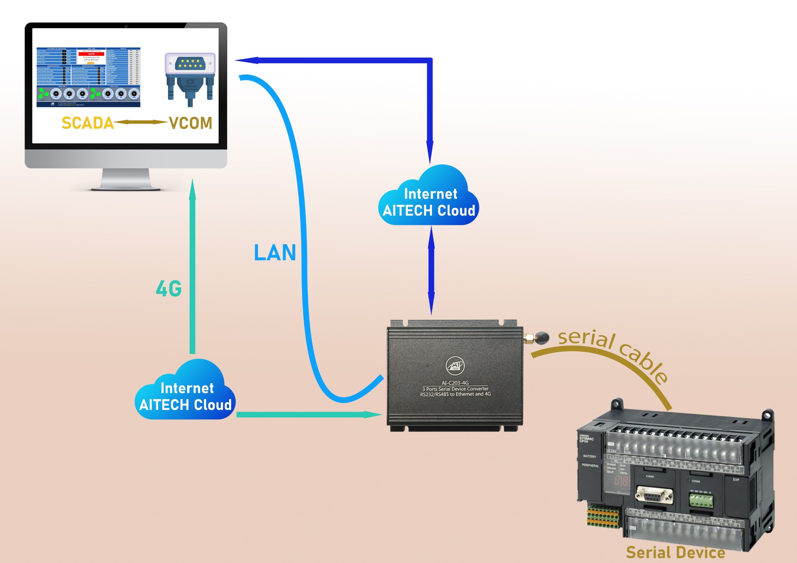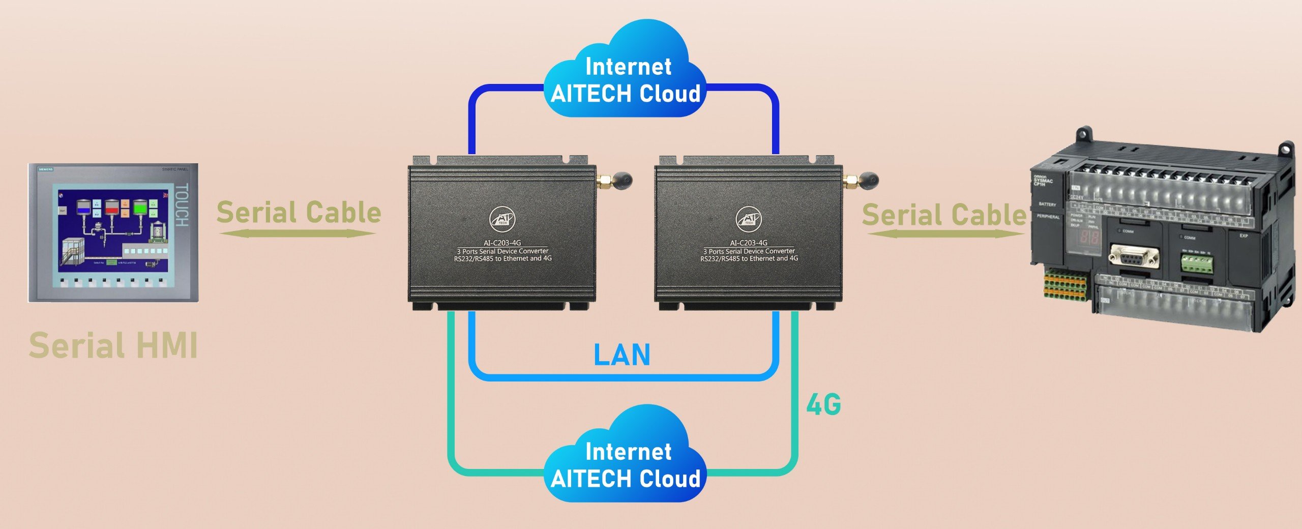 Bộ chuyển đổi AI-C203-4G nhận dữ liệu từ giao diện RS-485/R-S232 và chuyển đổi sang dạng có thể truyền đi qua Ethernet hoặc mạng di động 4G; Và ngược lại chuyển đổi dữ liệu từ Ethernet hoặc mạng di động 4G về dạng serial để giao tiếp với thiết bị.